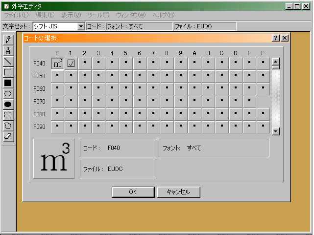 | F登録する | [編集(E)]→[同じコードで保存(R)] ※これでで外字エディタの御用は終わり。 |