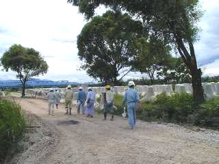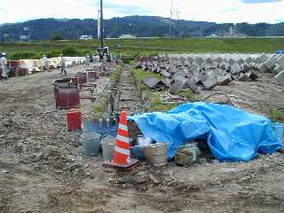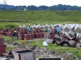 まずそこの代理人が現場説明をし、続いて場内を15分程度巡視する。この日は4か所の現場を巡回した。 連日30℃を越す猛暑の中での作業なので、熱中症対策についての質問が多かった。この現場では立木があちこちにあり、その木陰を利用する工夫がされていた。 根固めブロック(四脚)を現場附近で製作作業中。 |