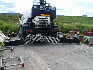 同 上 | このクレーンの左側アウトリガーの出が少ないとの意見があったのだが、機械自体に警告装置(リミット)があることと、吊荷の重量、移送距離、移送角(範囲)の面で問題はないとのこと。目一杯広げるのが原則だと思うけれど。(あまり気にしたことがなかったなー。) |