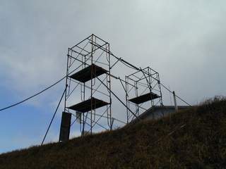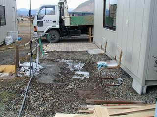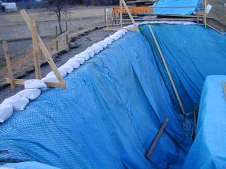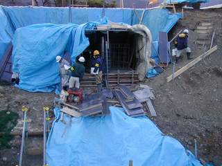 この地区は風が強く冷たい。ブルーシートで密閉(E工事現場) |