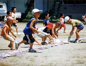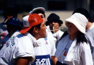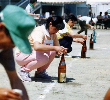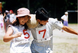 今年も綱引きやリレーなどの競技では選手はもちろん、そこにいる応援団全員 に力が入り盛り上がりました。また、ウルトラクイズ、紙コップで一升ビンを一杯 にする種目、そして新種目の割りばしを使って輪ゴムをリレーする種目、ヒモを つなげていく種目などは運や器用さが勝敗につながり、最後まで得点争いが繰 り広げられました。 写真[種目:なかよしさん] |