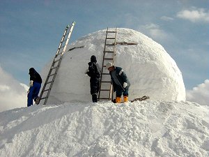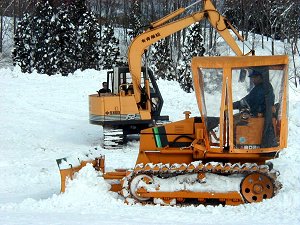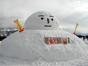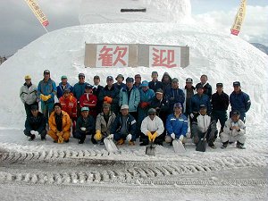 完成!雪祭りで雪像づくりの経験は何度かありましたが、 この単純な雪だるまづくりが以外にも難しいものでした。 また、労働とは違い、終日わきあいあいとなごやかな雰囲気 の中で作業が進められたことご報告申し上げます。 参加された皆さんごくろうさまでした。 |