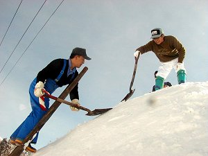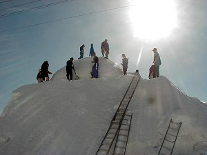 2001 [ 雪だるまづくり ] 去る2月14日、冬期長野いいやま国体のバイアスロン 競技会場近くに歓迎の雪像づくりを行いました。 (なべくら森の家手前。標高600m、積雪3.5m) 写真[製作前] |