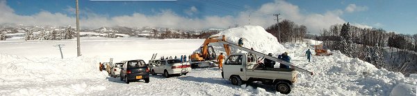 七地区の新旧区長、集落公民館長と、公民館専門部員の 計30名ほどが昇り旗立てなどの作業を含め雪だるまづくり に掛かりました。 前日までに道路除雪のロータリー車で雪を積み上げてもらい、 当日は更に雪を積んで高さ6m大の雪の山をこしらえて、上部 から削りました。 |