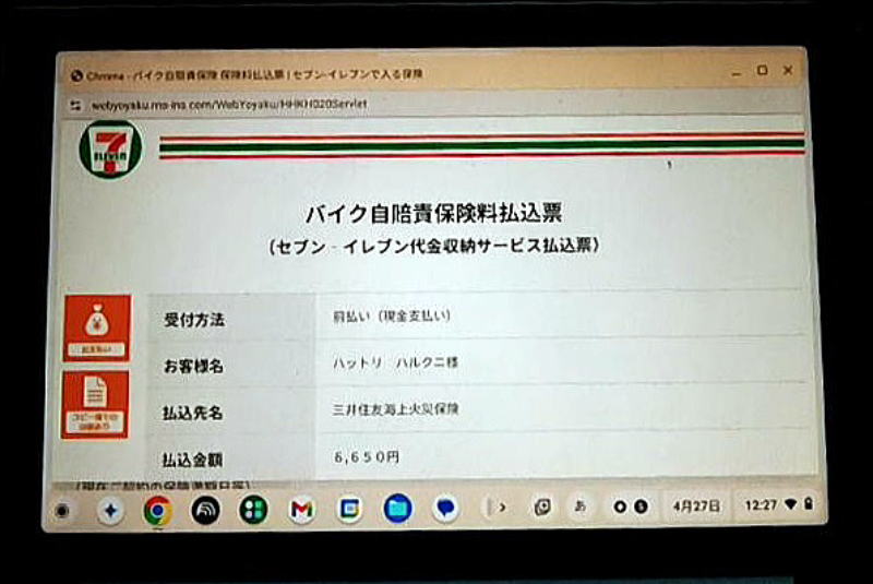 払込票画面(↑) セブンイレブンで表示させる前に