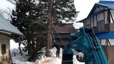 屋根の融雪を妨げる大木を芯止め
