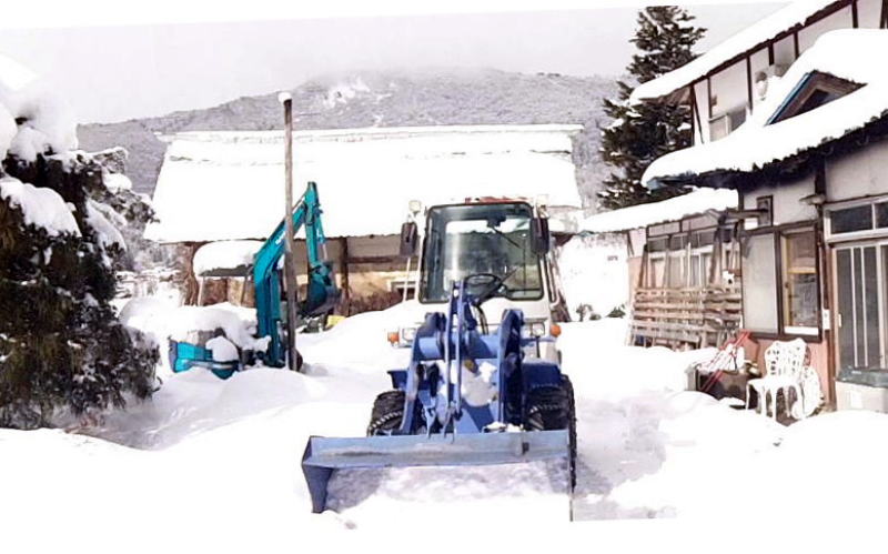 ⇒ その間、除雪機に積もった雪を払い