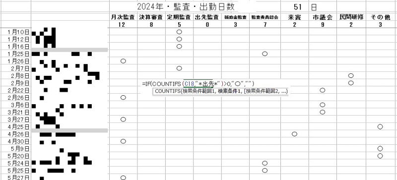 入力文字から、自動的に分類して項目欄に○印、出勤日数自動計上