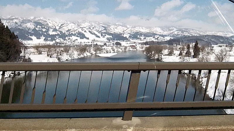 千曲川・菜の花大橋、向こうに見えるゲレンデは戸狩スキー場