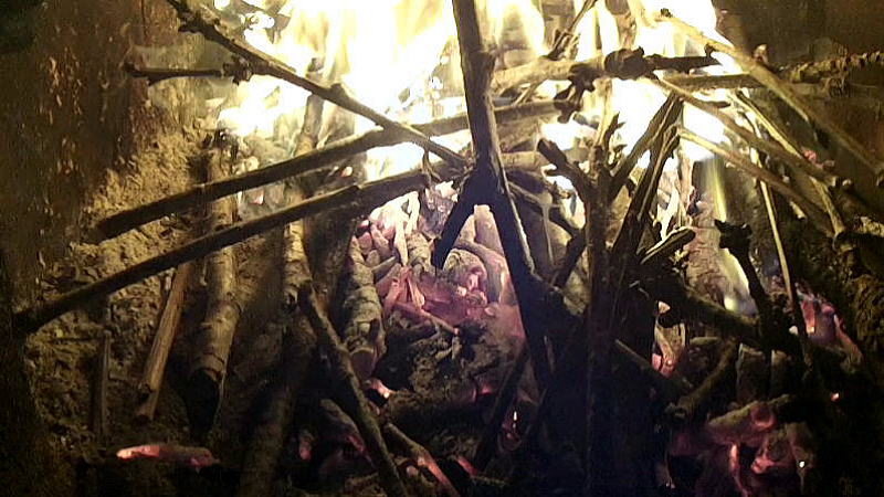 ぼや(小枝) を くべ まわりで一家団欒する囲炉裏